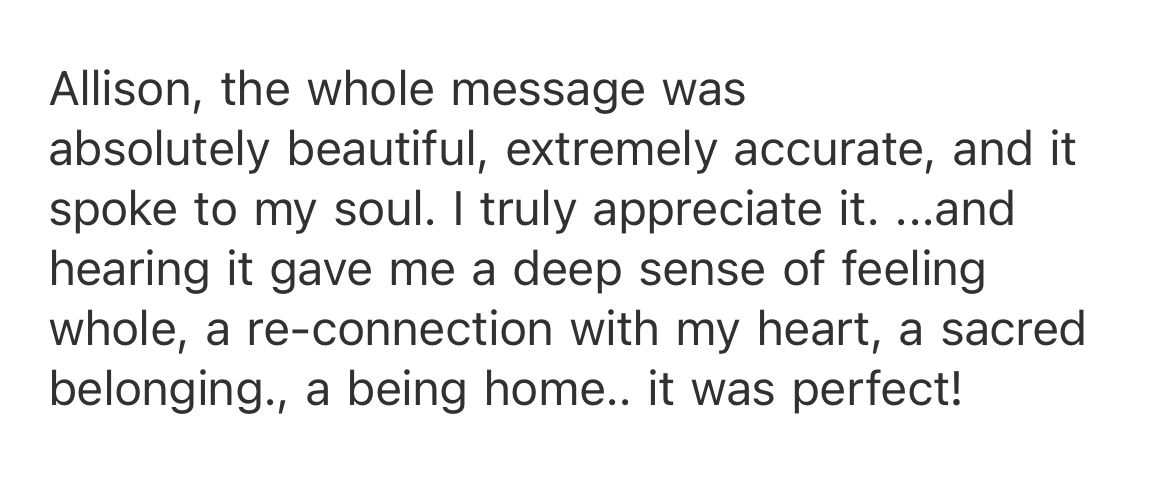 "Wow... thank you Allison. I am a little beside myself! What was said couldn't be more true. It's quite overwhelming. I appreciate the validation that what you shared is my purpose. Thank you so much for your insight!"